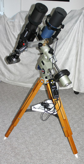 Autoguiding: QHY5 an Off Axis Guider auf EQ6-Montierung mit VTSB-Tuning (Sanyo Denki-Motore, neue Lager, Verkabelung, Polhöhenschrauben) u. MTS3-SDI-Goto-Steuerung sowie manuelles Guding: 4"-Skywatcher-Maksutov f=1300mm (f/13) als Leitrohr auf Parallel-Montageplatte auf GP-Montierung mit DK3-Steuerung u. Motoren |