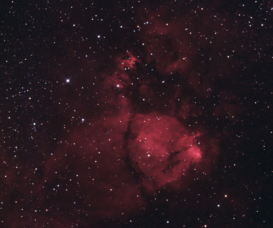 Luminanz+rot: Astronomik H-Alpha 13nm 2", grün/blau: IDAS LPS-P1 2" 1200mm GA-4 inkl. 2x-Barlow an 4"-Leitrohr f=1000mm L/rot: Canon EOS 300D ohne IR-Sperrfilter, grün/blau: Canon EOS 10D L/rot: 12x6 min. ISO1600, grün/blau: 12x5 min. ISO800, Darkframe-Abzug fst 5,3 72°-80° 05./06.11.2005 2-5°C Berlin-Heiligensee Seeing 2-3" HaHaGB-Komposit |