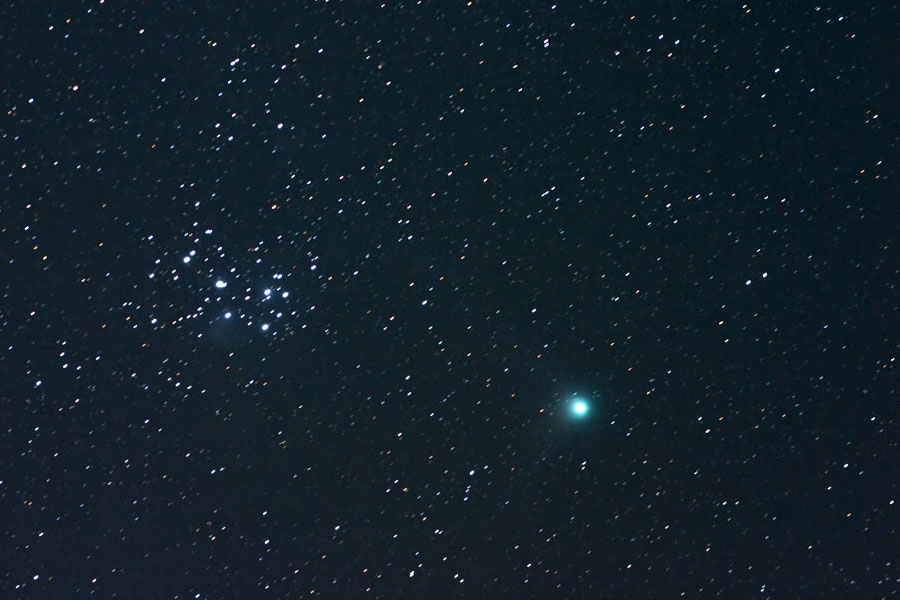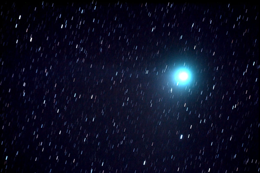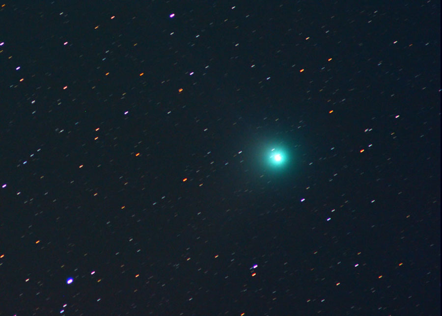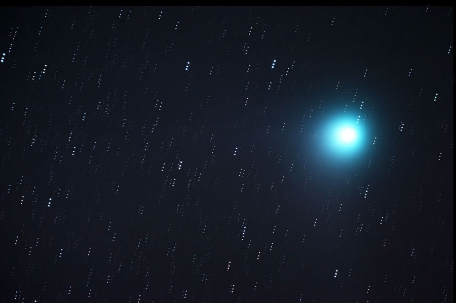 80mm ED Refraktor, f/7,5 auf EQ6 IDAS LPS-P1 2" 600mm GA-4 inkl. 2x-Barlow an 4"-Leitrohr f=1000mm Canon EOS 10D 5x5 min., ISO800, Darkframe-Abzug fst 5,2 40° 16.01.2004 Berlin-Heiligensee 0°C Seeing 5" Die Bilder mußten auf Sterne nachgeführt werden, weil der Komet zur Nachführung zu schwach war. |
