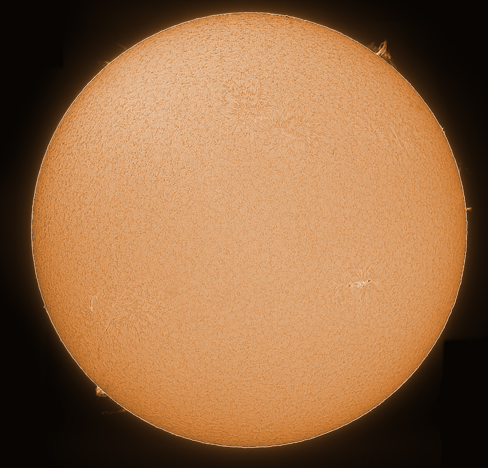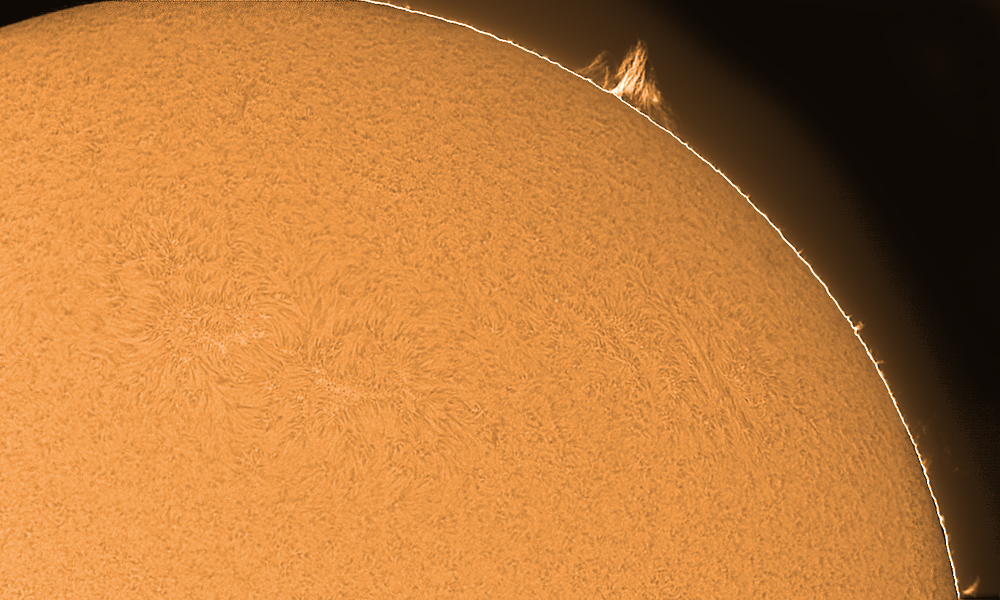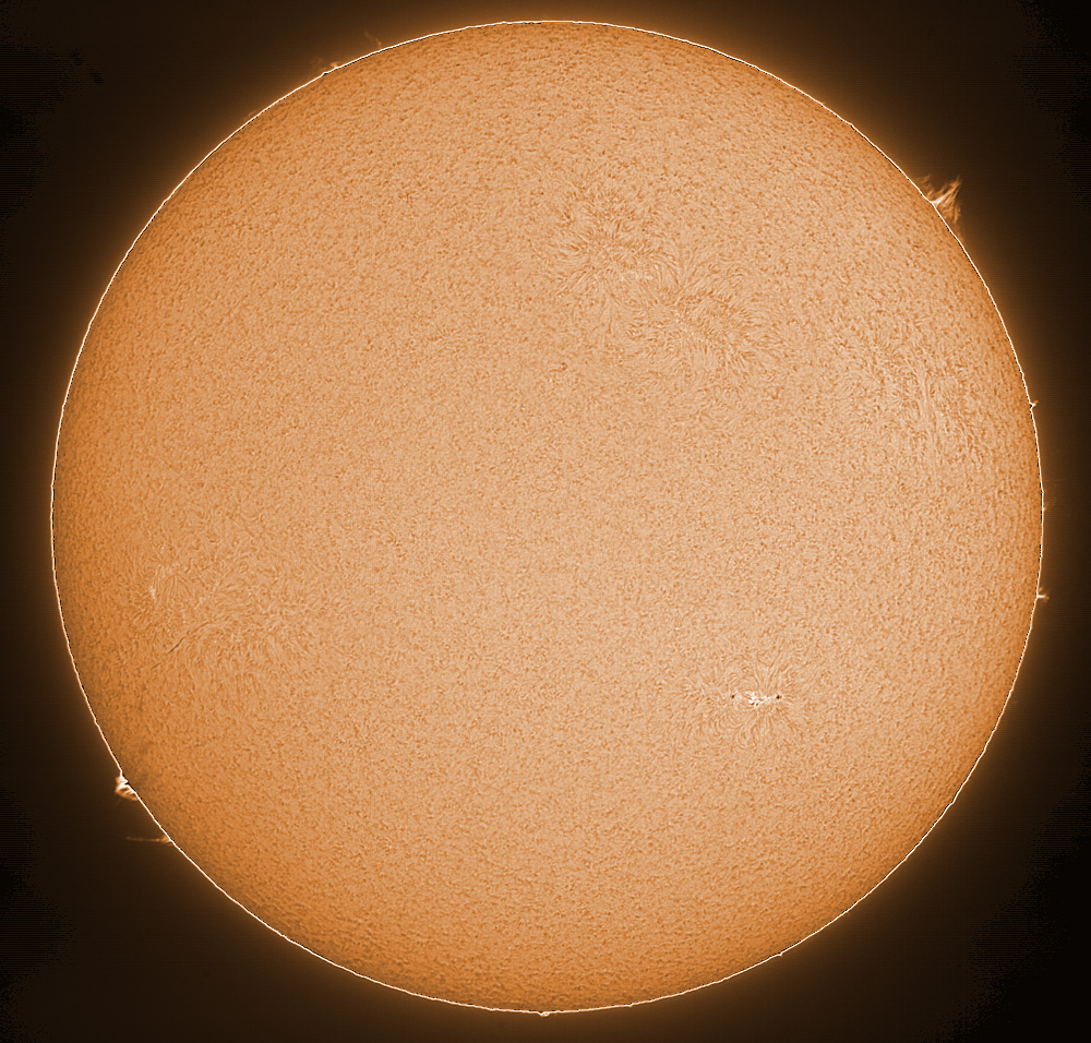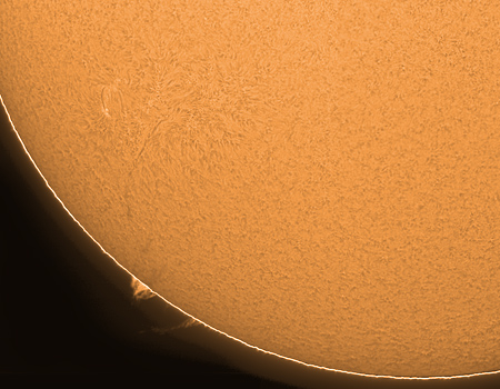 60mm LUNT-Teleskop (LS60T Ha mit B1200-Filter) auf Vixen GP-Montierung f=750mm (verlängert mit Baader Flat Field Converter) H-alpha-Filter 0,8 Angstroem QHY5 20.02.2010 Berlin-Heiligensee Komposit aus Teilbildern der Sonnenscheibe und des Randes |